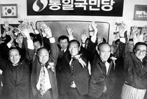 ← 3월24일 총선에서 31석을 획득 손을 들어보이는 정주영과 통일국민당 의원들