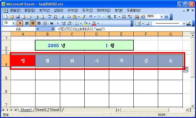 <2> A4셀에 수식을 =text(column(a1),"aaa") 입력하신 후 B4:G4까지 해당수식을 복사하면 아래의 그림처럼 해당 셀에 요일이 표시됩니다.