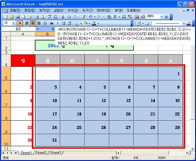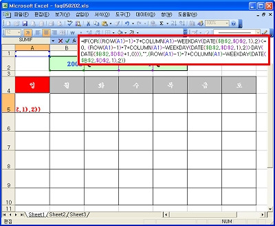 <3> A5셀에 아래와 같은 수식을 입력하세요. =IF(OR((ROW(A1)-1)*7+COLUMN(A1)-WEEKDAY(DATE($B$2,$D$2,1),2)<=0, (ROW(A1)-1)*7+COLUMN(A1)-WEEKDAY(DATE($B$2,$D$2,1),2)>DAY(DATE($B$2,$D$2+1,0))),"", (ROW(A1)-1)*7+COLUMN(A1)-WEEKDAY(DATE($B$2,$D$2,1),2))