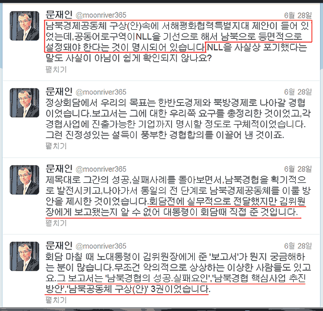 블로그와 트윗등 모든 언급을 보건데, NLL포기 아니다 쟁점의 촛점인 " NLL기준 (등거리) 등면적" 제시는 문건으로 김정일 면전에서 전달된 지도건... 하여간 그게 뭐건~ 어떤 형태로건 회담 전후. 또는 회담 당시, 어떤 시점이건 북측에 전달된 것은 사실인 것 같다. 아니~ 사실이고 자시고, 참여정부의 대북정책과 대응은 문재인 블로그나 트윗 그림에서 주장하듯 어김없는 일관성이며 입증도 가능할 것같다. 굳이 국가기록물 열어보지 않아도 말이다.