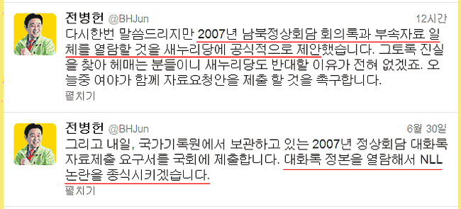 # 콩꺼풀의 마법 " NLL 대화록" - 전병헌 원내대표 트윗보라 분명히 " 대화록 정본" 을 보겠다는 것이다. "노대통령의 발언" 을 보겠다는 것이다.