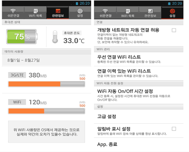 배터리 전원 잔량, 온도, 데이터 사용량, 등 유용한 정보 열람기능