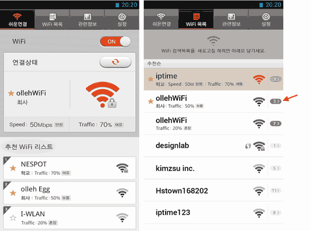 도심지의 수많은 중계기지국 송출 '올레 와이파이' 중에서도 상태가 가장 양호한 신호를 보내는 올레의 구체적인 AP를 골라내서 단골로 항상 접속하는 우선연결 '☆ 노란별표' 로 선택시키는 기능