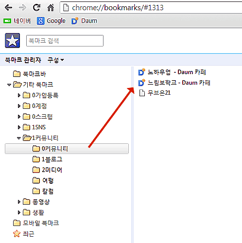 [기타 북마크] 하위 폴더인 [0커뮤니티] 폴더를 열어 봅니다 ▼