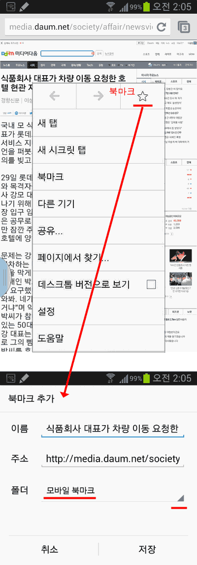 그런데, 스마트폰 이용환경은 대부분 이동 중인 상황입니다. [추가 폴더] 열거나 [새 폴더] 생성해서 정리하여 북마크를 저장할 경황이 없는 상태입니다. 그때 그때 즉시로 그냥~ [저장] 등록 하기 마련이죠.