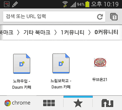 ▲ 상기 그림처럼, PC크롬' 에서 작업분류했던 북마크 페이지 3개 (카페 2곳 독립 사이트 1)가 그대로 스마트폰의 '모바일 크롬' 에도 동기화 되었습니다. 디렉토리 구조 순서까지 똑같습니다. 이것이 '동기화' 입니다.