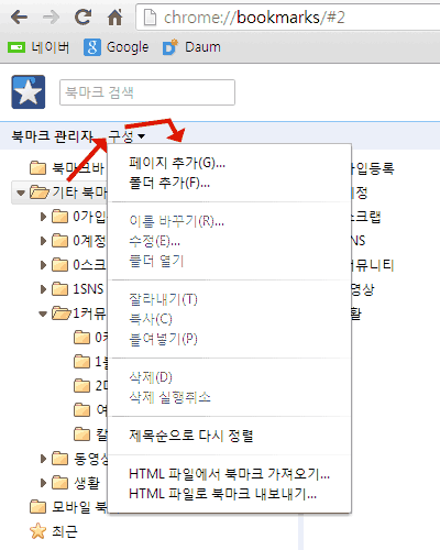 ▲ [기타 북마크] 폴더를 클릭해서 위치를 지정한 후, [구성] 메뉴를 클릭하면 열리는 창에서 [폴더추가]메뉴를 클릭하면, [기타 북마크] 폴더하위에 '새 폴더' 가 생성 됩니다. 만들어진 '새 폴더' 를 클릭해서 지정한 후 [이름바꾸기] 메뉴로 원하는 폴더명칭을 타자로 쳐서 변경명칭을 등록합니다.