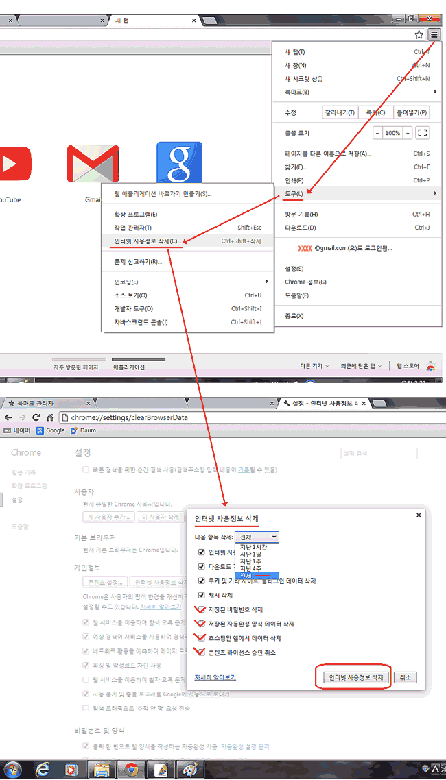 1) [인터넷 사용정보 삭제] 팜업창속에 '기간항목' 박스에 '▼ '표식을 눌러서 열리는 기간중에서 '지난4주' 아래에 보이는 '전체' 기간을 선택 지정한 후에, '다음항목 삭제' 아래에 보이는 선택항목도 빠짐없이 전부 체크 선택한 다음, 맨 하단의 [인터넷 사용정보 삭제] 버튼을 눌러서 모든 기록을 삭제 합니다.