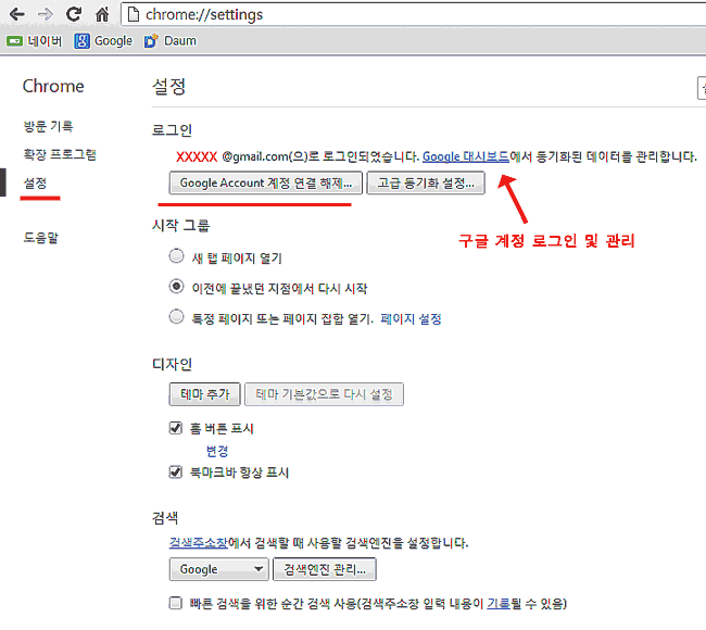 ▲ 크롬의 [설정및 관리] 메뉴로 열려진 새 메뉴창에 보면 " xxxx@gmail.com(으)로 로그인 됨" 상태를 보여주고, 그 바로 밑에 위치한 [설정(s)] 메뉴를 클릭하면 아래와 같은 그림의 [설정] 탭 화면이 나옵니다 ▼