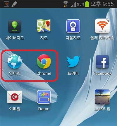 안드로이드 폰 경우엔 기본으로, 아래 그림처럼 2가지 브라우저가 홈(=바탕화면)에 등록되어 있습니다.