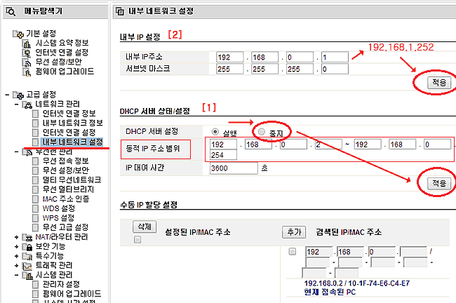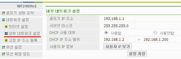 * "내부 네트워크에서 DHCP서버 발견시 공유기의 DHCP 서버기능을 중단" - 이 메뉴는 신경쓸 것 없음