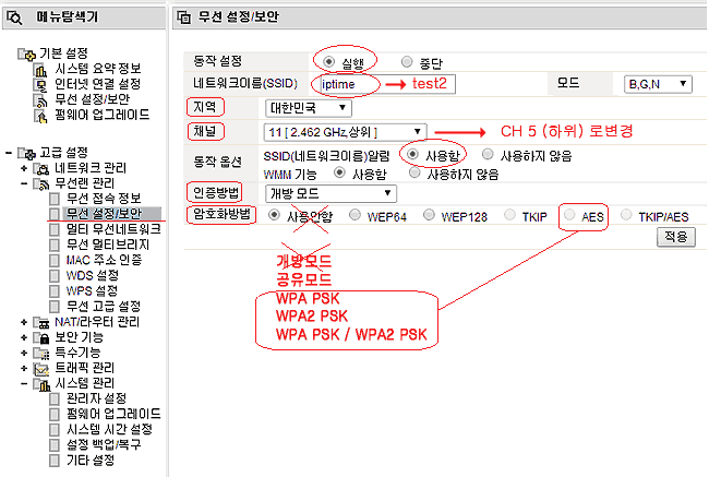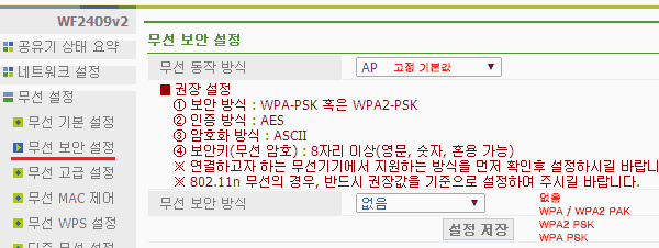 - WPAPSK 보안 인증방식은 AES 이며, 암호와 방식은 ASCII, 보안키는 8자리 이상