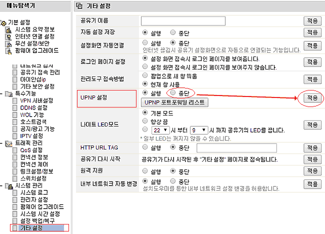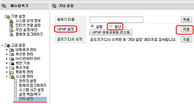 UPNP 설정: 초기값 (*) 실행 에서 > (*)중단으로 변경 선택후 적용 확인
