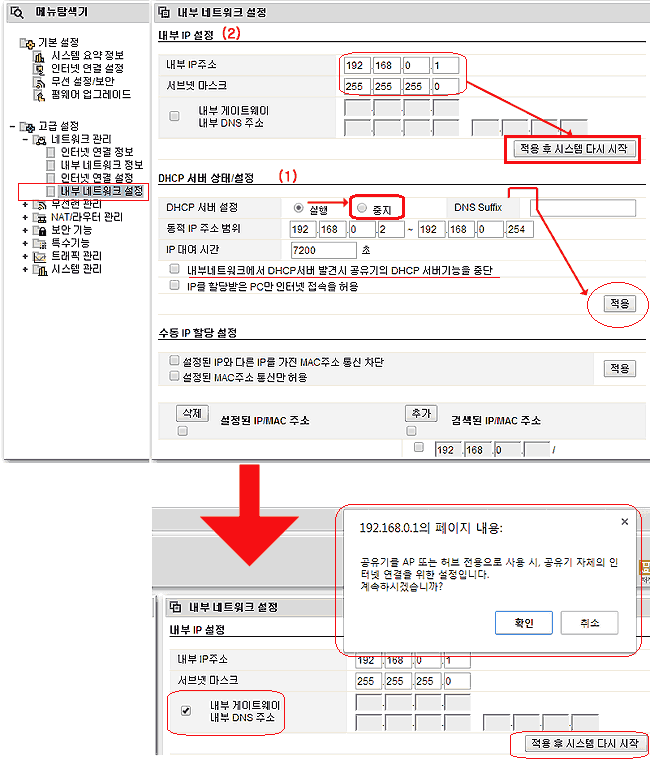 * 내부 게이트웨이 내부DNS 주소 메뉴 선택시 " 공유기를 AP또는 허브 전용으로 사용시 공유기 자체의 인터넷 연결을 위한 설정 입니다 계속하시겠습니까" - 이 메뉴가 사설 네트워크에서는 기능 안되는 경우가 많음, 따라서 신경 끌 것.