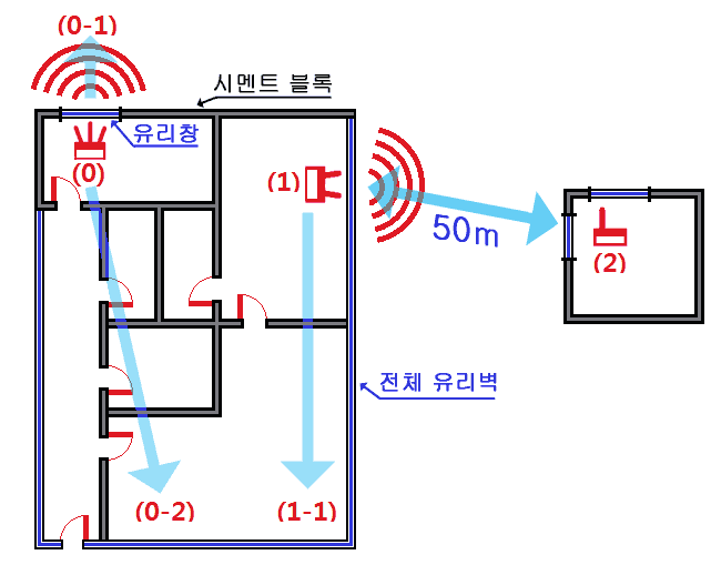 - A건물 좁은창 실내 (0)위치의 전파가 B건물 실내 (2)위치까지 송달 불가