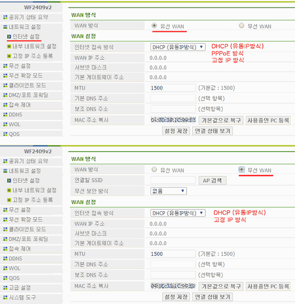 ◈ 무선WAN: 통신사 인터넷 WAN (= 인터넷 전송신호)을 무선으로 받아서 유선으로 분배하는 공유기 모드