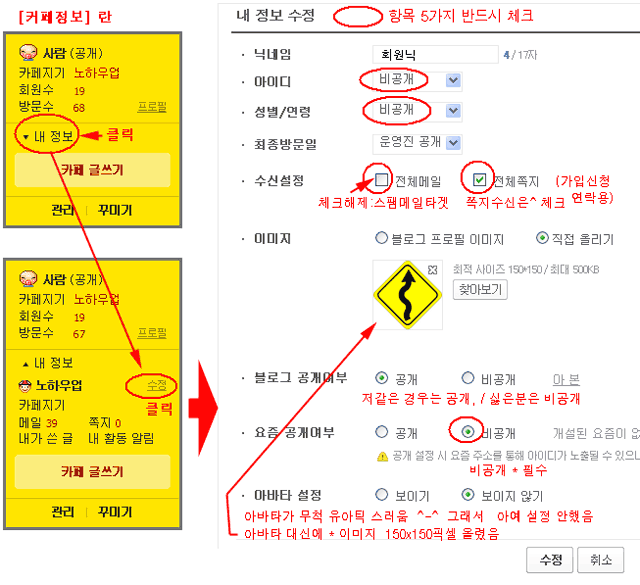 [카페정보 박스]안에 [내 정보]를 클릭하면 나오는 [수정 메뉴]를 클릭하면 [내 정보 수정]창이 뜹니다. 그 창에서 '빨간 동그라미'친 '5개 항목' 을 주목하세요.