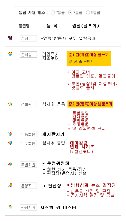 여기서, '한 줄 코멘트' 의 [준회원]을 제외 한다면, 본문게시판에 '본문 글쓰기' 구분 등급은 [정회원] 과 [우수회원] 용도별로 '2단계'뿐 입니다.