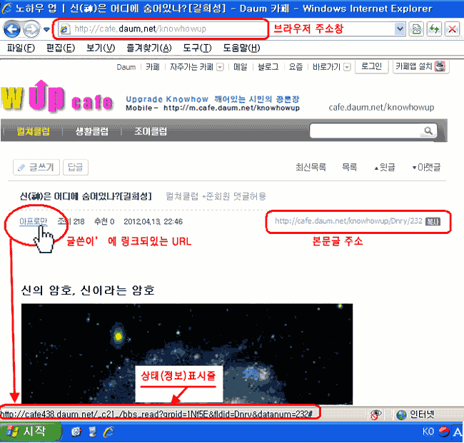 그림에서 보여주듯이 [글쓴이] '아프로만' 부분에 마우스를 대보면 커서가 손모양으로 변하면서 브라우저 하단의 상태/정보 표시줄에 해당글의 이동주소가 표시됩니다.