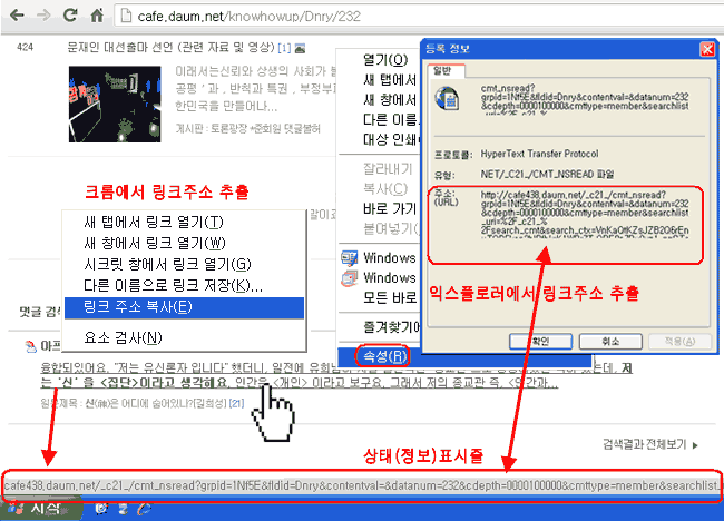 링크가 있는 부분에 마우스를 대보면 커서가 손모양으로 변합니다. 그 상태에서 마우스 우측버튼 클릭하여 열리는 창에서 [속성] 메뉴를 클릭하면 또 열리는 작은창 [등록정보] 창 하단에 [주소(URL)] 이 표시됩니다.이 부분을 마우스로 긁어서 복사 (= Ctrl+C 동시 Key키 누름) 한 후에, 붙여넣기 할 게시판이나 워드나 메모장에 붙여넣기 (= Ctrl + V 동시 key누름) 하면 링크주소를 추출할 수 있습니다