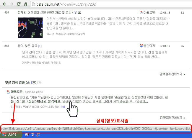 ▲ 검색된 댓글부분에 마우스를 대보면 커서가 손모양으로 변하면서 브라우저 하단 상태정보 표시줄에 해당 댓글의 이동주소를 보여줍니다. 손모양 커서 상태로 클릭을 해보면, 본글 부분이 아니라 검색된 댓글부분으로 [직접 이동] 합니다