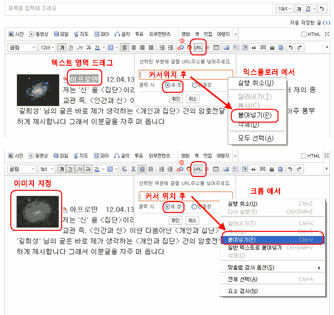 ※ 붙여넣기 안내창이 '익스플로러' 와 '크롬' 이 좀 다릅니다. 안내창을 이용하기 보다는 단축 키보드 메뉴 (= Ctrl + V 동시 Key누름) 로 붙여 넣기 하면 됩니다