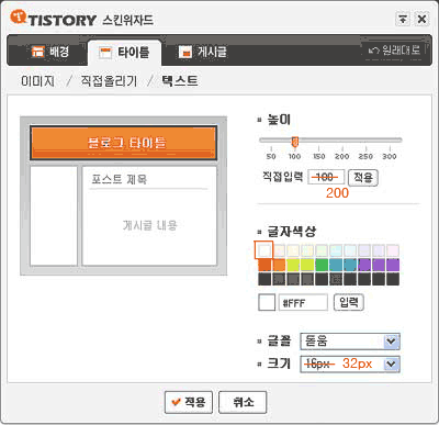 티스토리 '스킨위자드' 에서, 타이틀 영역 높낮이 지정은 # 타이틀 > 텍스트 - [높이]에서 정합니다