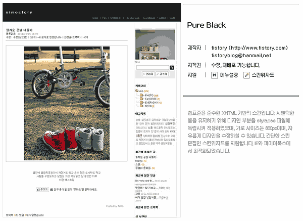※ Pure Black 스킨 특징은, [타이틀 텍스트] 와 [카테고리 배치] 라인 높낮이 변경 안되는 '고정식' 이라서, 타이틀 영역 높이를 크게키워도 함께 이동하지 않는 '위치 붙박이' 입니다.