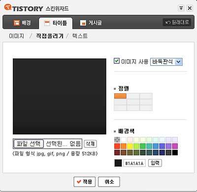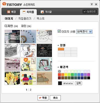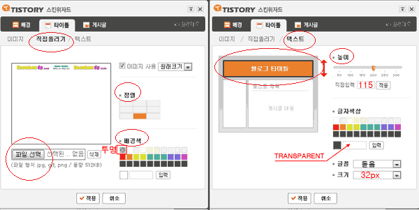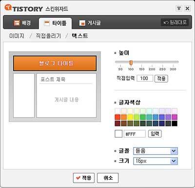 ※주의 : 스킨위자드 박스하단 [적용] 버튼은, 각각의 변경항목마다 적용하는 버튼 아니라, 모든 항목의 [입력] 변경으로 '미리보기'까지 모두 마친 후 마음에 들면 맨 마지막에 세팅 등록하는 버튼이므로, 섣불리 먼저 누르면 안됩니다. [입력]변경으로 '미리보기' 디자인이 마음에 안들면, 즉시 [취소] 버튼 누르고 원래 블로그로 돌아가기 바랍니다.