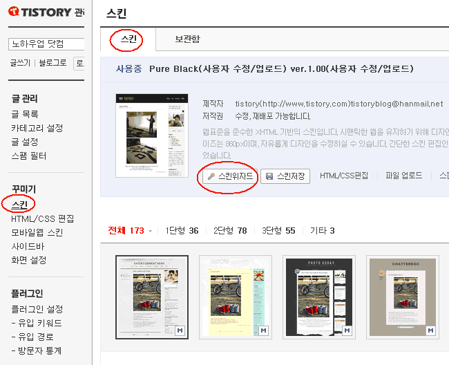 티스토리 블로그는 아래 그림설명처럼, # 관리자 > 꾸미기 > 스킨 - 메뉴에서,
