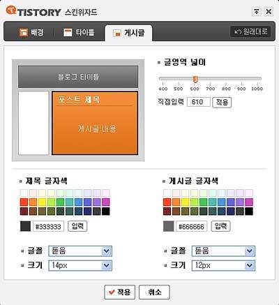 - 글 영역 넓이: 초기값 610 > 변경 730 으로 입력