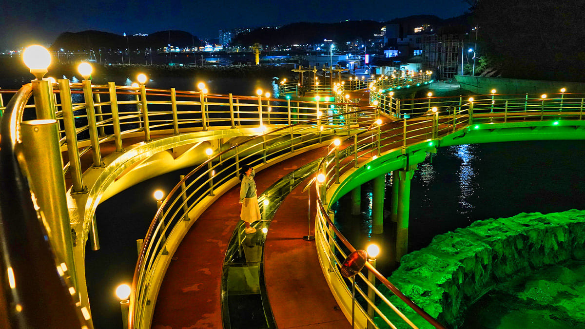 낮의 바다도 좋지만, 이곳의 진짜 매력은 해가 지고 난 이후부터 펼쳐집니다. 해상스카이워크에는 형형색색의 LED 경관조명이 설치되어 있어, 해 질 무렵부터는 다리 전체가 은은한 빛으로 물들기 시작합니다.