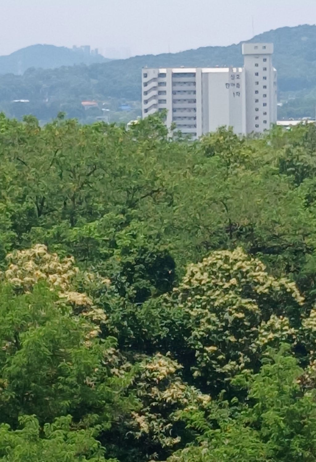 호수가 보이는 산 능선에 밤꽃이 풍성하게도 피었다