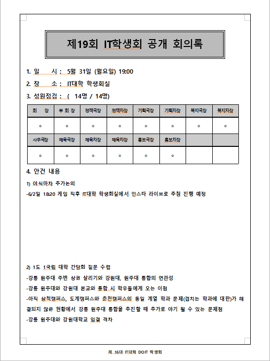 2021 제 19회 IT학생회 회의록 작성자아이티대|작성시간21.08.23|조회수14 목록 댓글 0 글자크기 작게가 글자크기 크게가 2021년 5월 31일 (월) 진행된 제19회 IT학생회 회의록입니다 다음검색 현재 게시글 추가 기능 열기 북마크 공유하기 신고 센터로 신고 댓글 댓글 0 댓글쓰기 답글쓰기 댓글 리스트