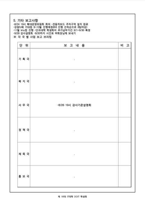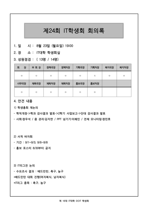 2021 제 24회 IT학생회 회의록 작성자아이티대|작성시간21.09.23|조회수89 목록 댓글 0 글자크기 작게가 글자크기 크게가 2021년 8월 23일 (월) 진행된 제24회 IT학생회 회의록입니다. 다음검색 현재 게시글 추가 기능 열기 북마크 공유하기 신고 센터로 신고 댓글 댓글 0 댓글쓰기 답글쓰기 댓글 리스트