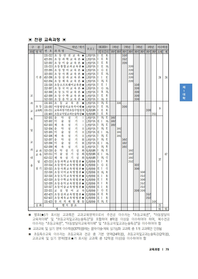 전공 기본영역에서 12개 교육론, 초등안전교육 필수 이수. (총 13개)