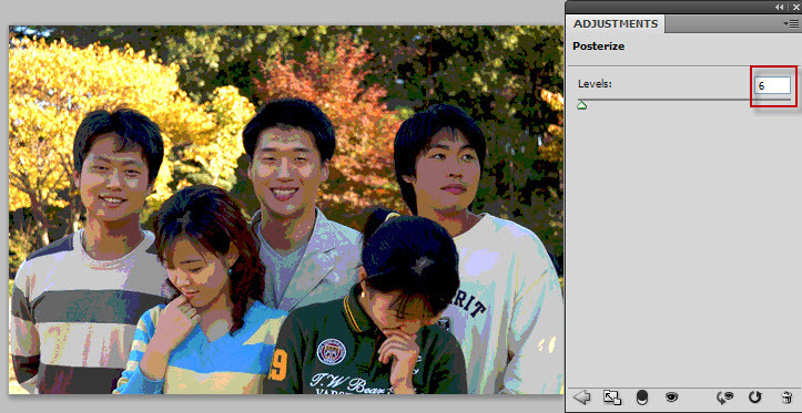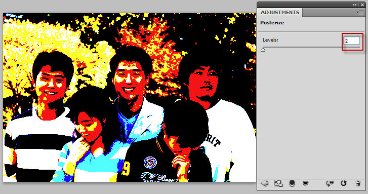 예들 들어 RGB 이미지에서 Levels 단계를 2로 설정하면 각 채널의 색상이 2개의 색상으로 단순화 되며 총 6개의 색상으로 단순화 됩니다.