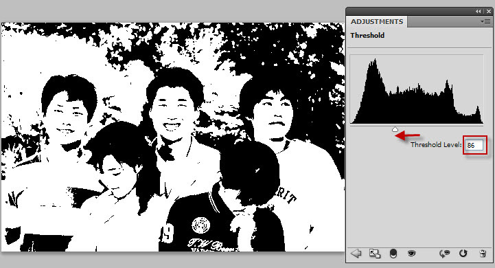 3) 슬라이드를 좌측으로 움직여 기준이 되는 명도를 86로 드래그 합니다. 86보다 높은 음영은 흰색이 되고 낮은 픽셀은 검정색으로 변경됩니다.