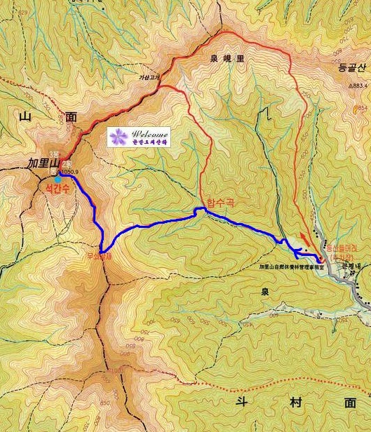 (가리산자연휴양림~강우레이더관측소(415m)~1km합수곡~1km무쇠발재~0.8km정상)