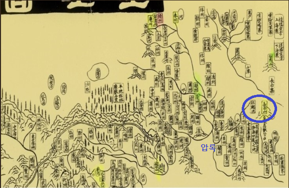 지도에서 압록수는 장백산 말갈지에서 발원한다. 그 압록수의 경로는 서쪽으로 해주와 은주 사이를 지나