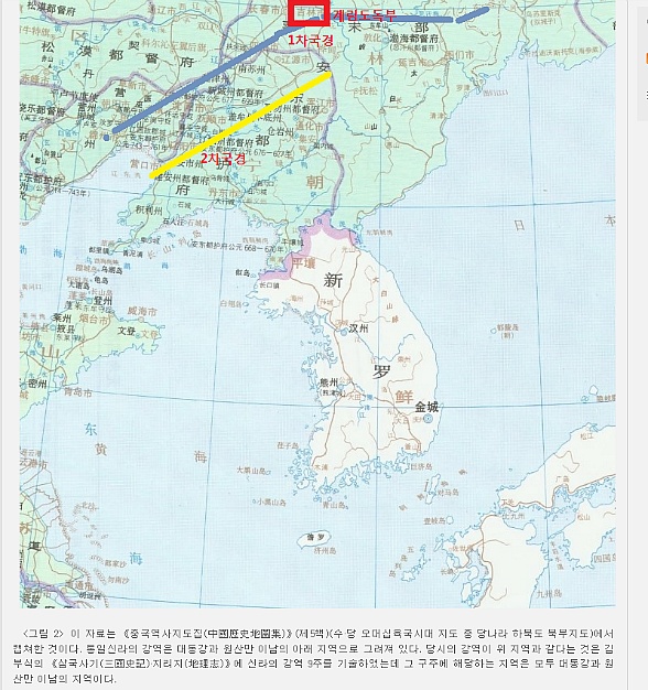지도에서 신라의 제1차 국경선은 광령에서 계림까지었고,제2차 국경선은 개주에서 청하의 발원지까지다.