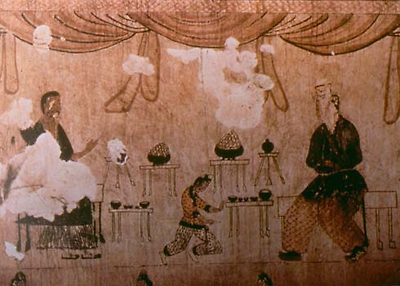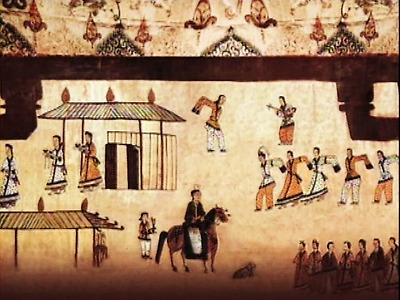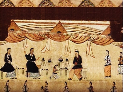 한쪽 무릎을 꿇고 음식을 올리는 시종위에 주인공은 당시 귀족들의 머리장식으로 알려진 백라관을 쓰고 앉아