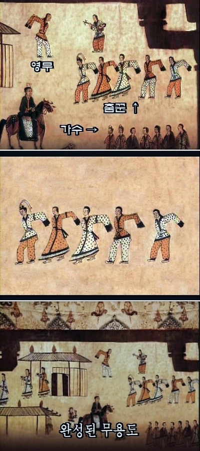 아래 일곱명은 노래를 부르는 가수들이라고 한다. 그리고 이 가운데 다섯사람은 영무에 지휘에 따라 춤을 추는