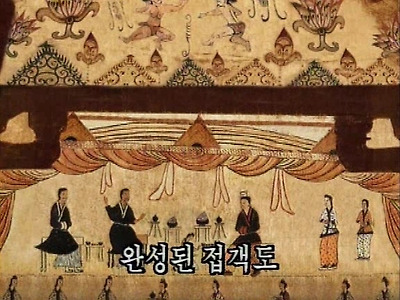 영상으로 복원된 접객도다. 접객도는 음식이 올려있는 탁자를 사이에 두고 손님과 주인공이 대화를 나누는