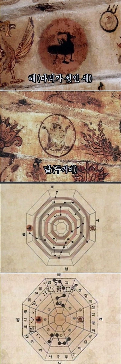 무용총 천장벽화에도, 자세히 보면 사후세계를 상징하는 그림들 속에 별자리가 희미하게 남아있는 것을 볼 수