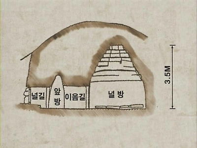각 계단은 조금씩 안으로 들어가게 쌓아 벽화를 그릴 자리를 남겼고, 마지막에 큰 돌로 천장 입구를 막았다.