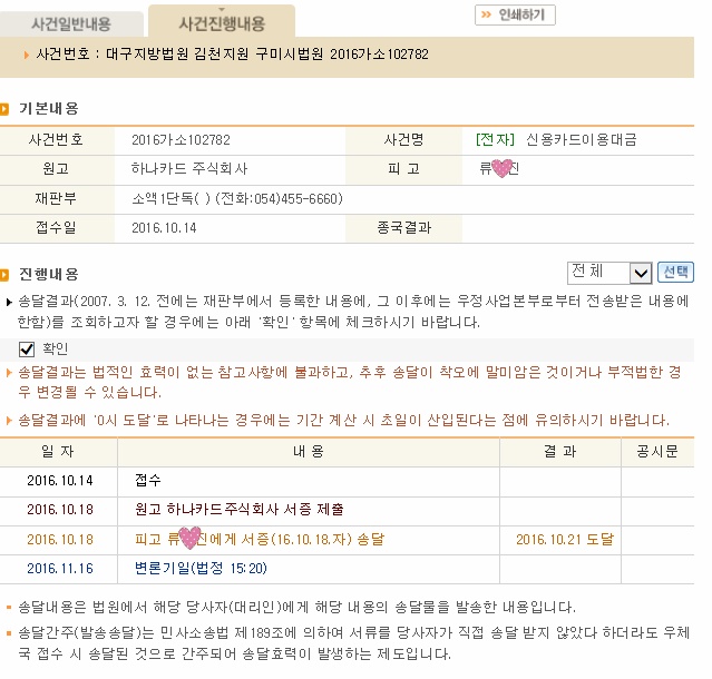 10월18일 하나카드가 서증을 제출해서 저에게 11월 16일 변론기일