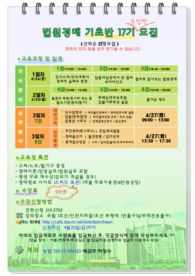 [대한공경매사협회인천] 법원경매 기초반 17기(주말집중반) 4월24일(토)/25(일)/27(화) [모집중] 작성자부자마인드|작성시간10.04.02|조회수502 목록 댓글 1 글자크기 작게가 글자크기 크게가 다음검색 현재 게시글 추가 기능 열기 북마크 공유하기 신고 센터로 신고 댓글 댓글 1 댓글쓰기 답글쓰기 댓글 리스트 작성자부자마인드 작성자 본인 여부 작성자 | 작성시간 10.04.02 1. 이곳에 댓글이나 전화로 수강신청을 하고 난후 2. 위 농협계좌로 입금해주세요 3.입금 한 후에는 입금했다고 다시 댓글을 남겨주시면 확인후 [입금완료]라고 다시 댓글을 달아 놓겠습니다. 오늘도 좋은 하루 행복한 하루 되세요 ^^ 댓글 전체보기