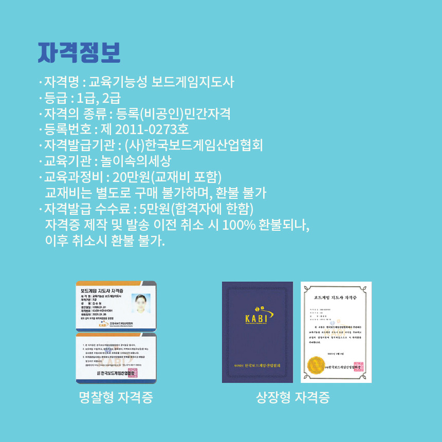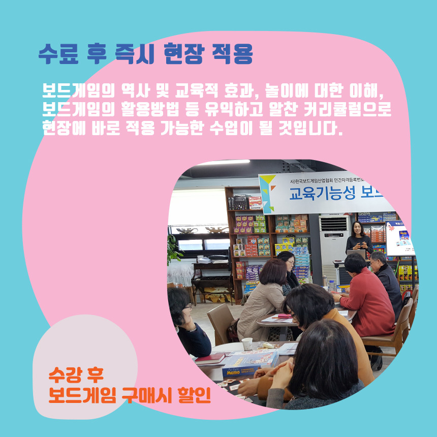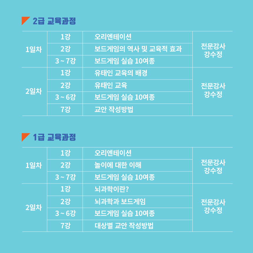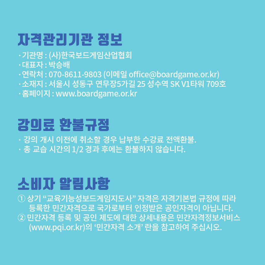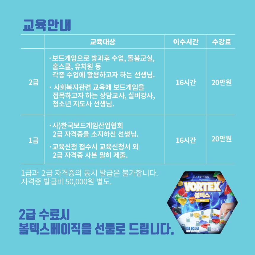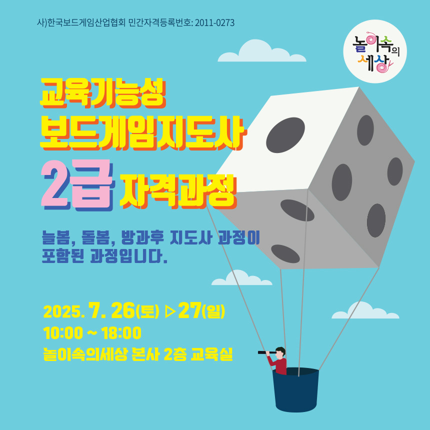 [한국보드게임산업협회]2025 교육기능성보드게임지도사 2급 자격과정 안내 2025. 7. 26(토)~27(일) 작성자김형용|작성시간25.06.30|조회수58 목록 댓글 0 글자크기 작게가 글자크기 크게가 다음검색 현재 게시글 추가 기능 열기 북마크 공유하기 신고 센터로 신고 댓글 댓글 0 댓글쓰기 답글쓰기 댓글 리스트