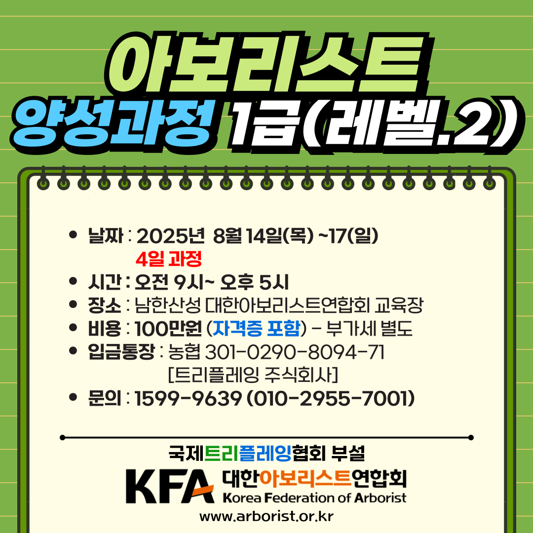 아보리스트 2급(레벨.1) 및 1급(레벨.2) 양성과정 모집 중입니다.